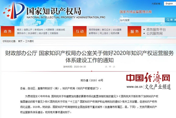 財政部辦公廳 國家知識產(chǎn)權(quán)局辦公室關(guān)于做好2020年知識產(chǎn)權(quán)運營服務(wù)體系建設(shè)工作的通知