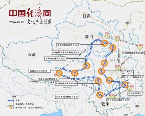 藏羌彝文化產業(yè)走廊依托的城市樞紐包括:四川省成都市、貴州省貴陽市、云南省昆明市、西藏自治區(qū)拉薩市、陜西省西安市、甘肅省蘭州市和青海省西寧市。