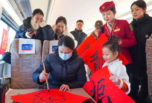 津興城際G8844次列車上,旅客現(xiàn)場(chǎng)手寫(xiě)書(shū)法福字、畫(huà)龍頭。(中國(guó)鐵路北京局集團(tuán)有限公司供圖)