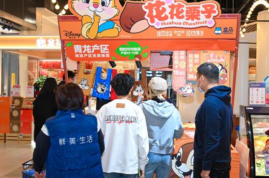 在哈一口氣便能凝結(jié)出霧的寒冬,暖呼呼的糖炒栗子最能溫暖人心。在午后的盒馬線下門店,糖炒栗子的檔口已經(jīng)排起了長隊,工作人員將剛炒制出來的新鮮栗子裝進了印有迪士尼人物奇奇蒂蒂形象的紙盒里,遞給消費者?!疤鹛鹋磁吹睦踝樱钸m合當(dāng)冬天小零食”、“沖著這個包裝來買的,太可愛了?!?/p>