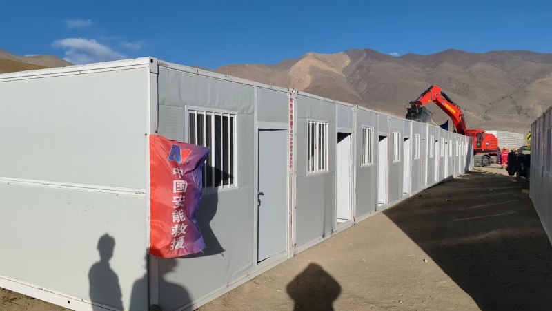 一排排活動(dòng)板房已初步搭設(shè)完畢。與臨時(shí)搭建的帳篷相比,這些板房保暖效果更好。目前,板房?jī)?nèi)設(shè)備正在逐漸完善,將盡快安排受災(zāi)群眾入住。 中國(guó)安能供圖