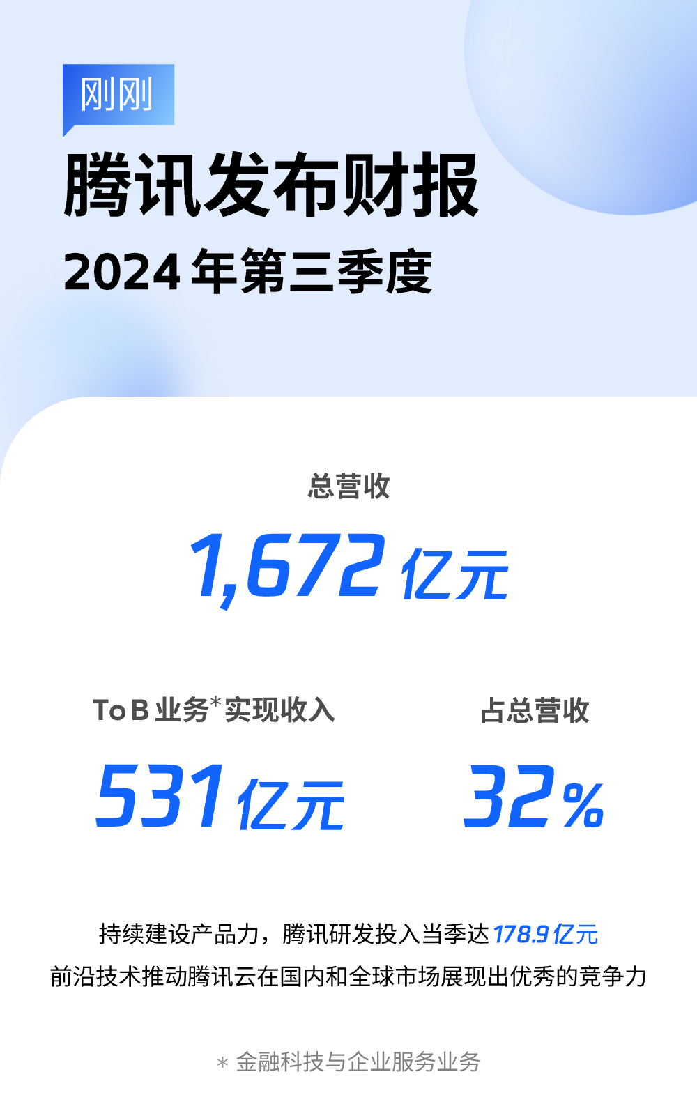 中國經(jīng)濟網(wǎng)北京11月14日訊(記者 李方) 11月13日,騰訊發(fā)布2024年Q3財報,當季度騰訊總營收1672億元,同比增長8%。騰訊ToB業(yè)務(金融科技及企業(yè)服務)實現(xiàn)營收531億元,占騰訊總營收的32%。其中,企業(yè)服務的收入增長受益于云服務和商家技術服務費推動,毛利受益于結(jié)構(gòu)優(yōu)化、效率提升獲得顯著增長。