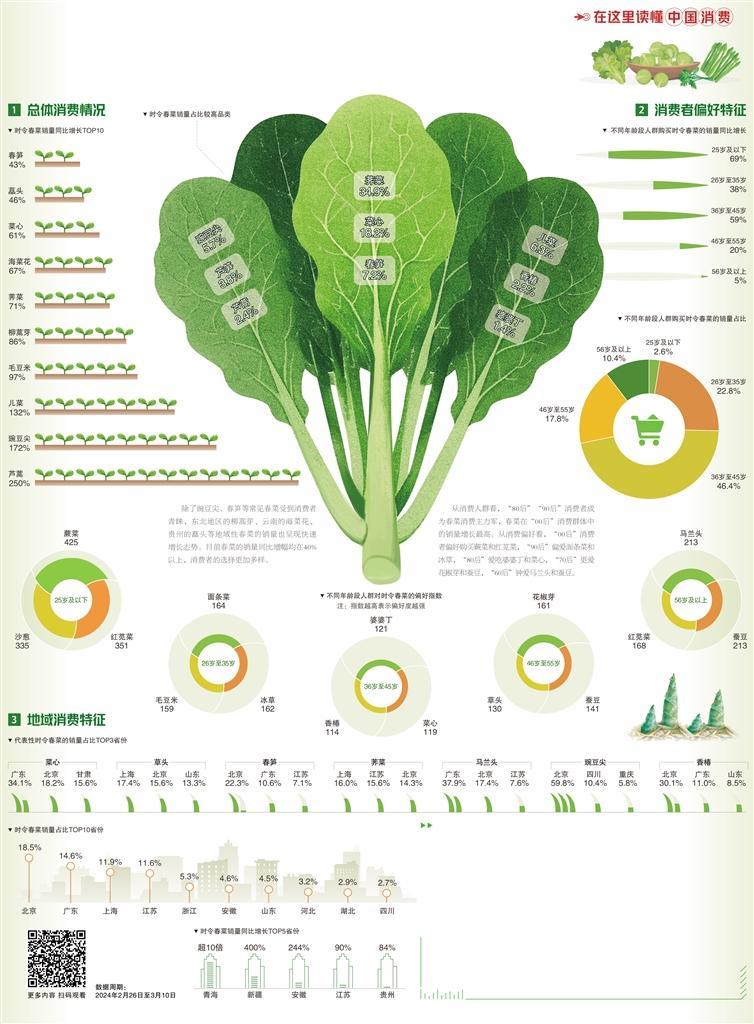 從地域消費(fèi)看,北京、廣東、上海、江蘇、浙江成為春菜消費(fèi)的主力省份,北京以18.5%的春菜銷量占比位居首位。隨著冷鏈、配送等物流基礎(chǔ)設(shè)施的不斷完善,過去只在局部地區(qū)售賣的春菜逐步突破地域限制,被全國(guó)各地的消費(fèi)者所購(gòu)買,如折耳根在湖南、甘肅、黑龍江的銷量同比增長(zhǎng)均超100%,菜心在安徽、陜西、湖南的銷量同比增長(zhǎng)均超60%,春筍在寧夏、新疆、北京的銷量同比增長(zhǎng)均超40%。