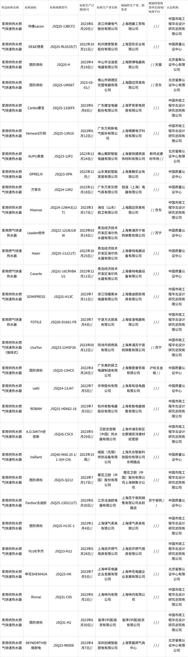 2023年上海市家用燃?xì)饪焖贌崴鳟a(chǎn)品質(zhì)量監(jiān)督抽查所檢項(xiàng)目符合相關(guān)標(biāo)準(zhǔn)的產(chǎn)品
