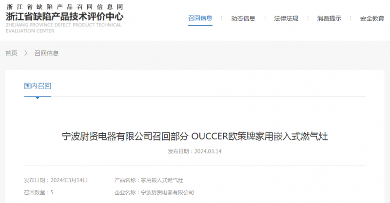 日前,寧波尉賢電器有限公司受缺陷調(diào)查影響按照《消費(fèi)品召回管理暫行規(guī)定》的要求,主動向浙江省市場監(jiān)督管理局和寧波市市場監(jiān)督管理局報告了召回計(jì)劃,將自即日起,召回2023年3月1日期間制造的OUCCER歐策牌JZY-OC20型號家用嵌入式燃?xì)庠?,涉及?shù)量為5件。