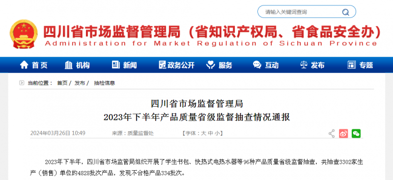 2023年下半年,四川省市場(chǎng)監(jiān)管局組織開(kāi)展了學(xué)生書(shū)包、快熱式電熱水器等96種產(chǎn)品質(zhì)量省級(jí)監(jiān)督抽查,共抽查3302家生產(chǎn)(銷(xiāo)售)單位的4828批次產(chǎn)品,發(fā)現(xiàn)不合格產(chǎn)品334批次。
