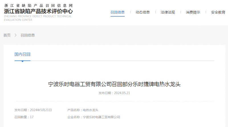 日前,寧波樂時(shí)電器工貿(mào)有限公司受缺陷調(diào)查影響按照《消費(fèi)品召回管理暫行規(guī)定》的要求,主動(dòng)向浙江省市場監(jiān)督管理局和寧波市市場監(jiān)督管理局報(bào)告了召回計(jì)劃,將自即日起,召回2023年5月27日至2023年5月28日期間制造的樂時(shí)捷牌ST1X3型號(hào)電熱水龍頭,涉及數(shù)量為17件。