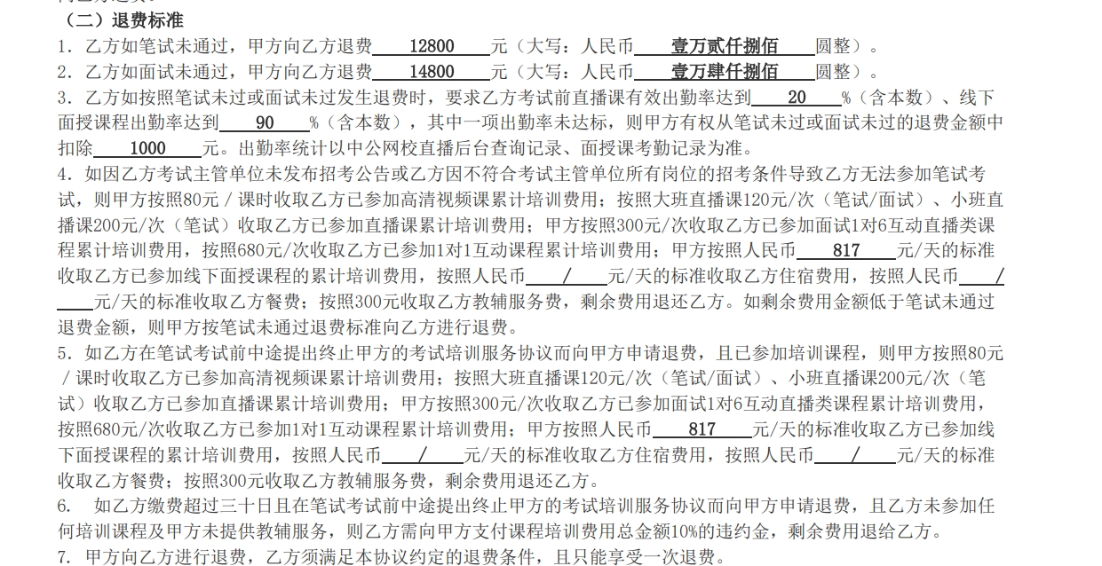 記者在武女士提供的其與中公教育簽訂的協(xié)議書里看到,符合出勤率等其他條件后,如果筆試或面試未通過,中公教育將為學員全額退款。學員需在規(guī)定時間內(nèi)提交相關(guān)材料申請退費,中公教育核實所提交材料真實、符合退費條件后,在30至45個工作日內(nèi)將約定的退費金額支付至學員提供的銀行賬戶。