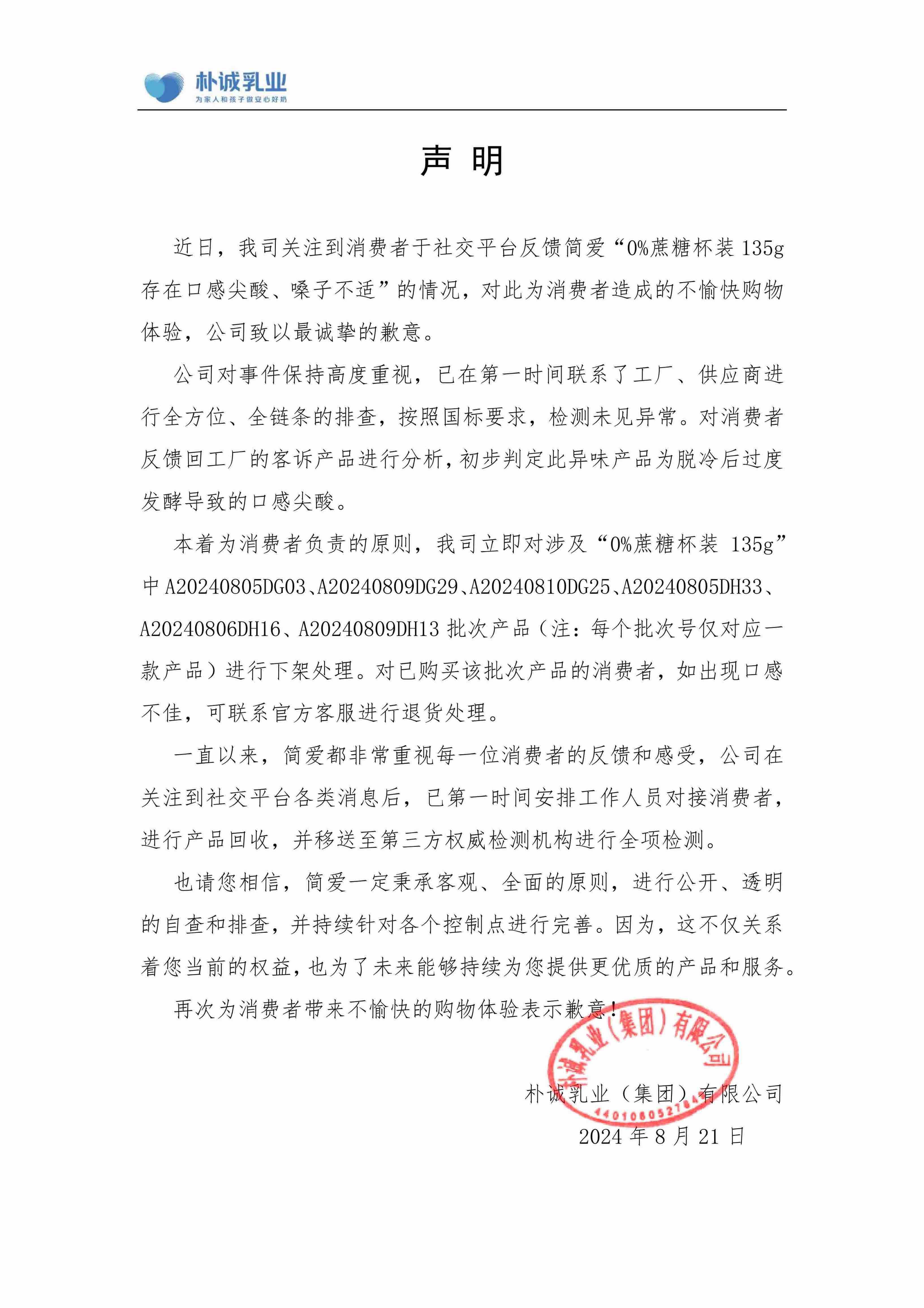 其在向記者發(fā)送的官方聲明中稱,公司已在第一時(shí)間聯(lián)系了工廠、供應(yīng)商進(jìn)行全方位、全鏈條的排查,按照國(guó)標(biāo)要求,檢測(cè)未見(jiàn)異常。對(duì)消費(fèi)者反饋回工廠的客訴產(chǎn)品進(jìn)行分析,初步判定此異味產(chǎn)品為脫冷后過(guò)度發(fā)酵導(dǎo)致的口感尖酸。本著為消費(fèi)者負(fù)責(zé)的原則,該司立即對(duì)涉及“0%蔗糖杯裝135g”中A20240805DG03、A20240809DG29、A20240810DG25、A20240805DH33、A20240806DH16、A20240809DH13批次產(chǎn)品進(jìn)行下架處理。對(duì)已購(gòu)買該批次產(chǎn)品的消費(fèi)者,如出現(xiàn)口感不佳,可聯(lián)系官方客服進(jìn)行退貨處理。