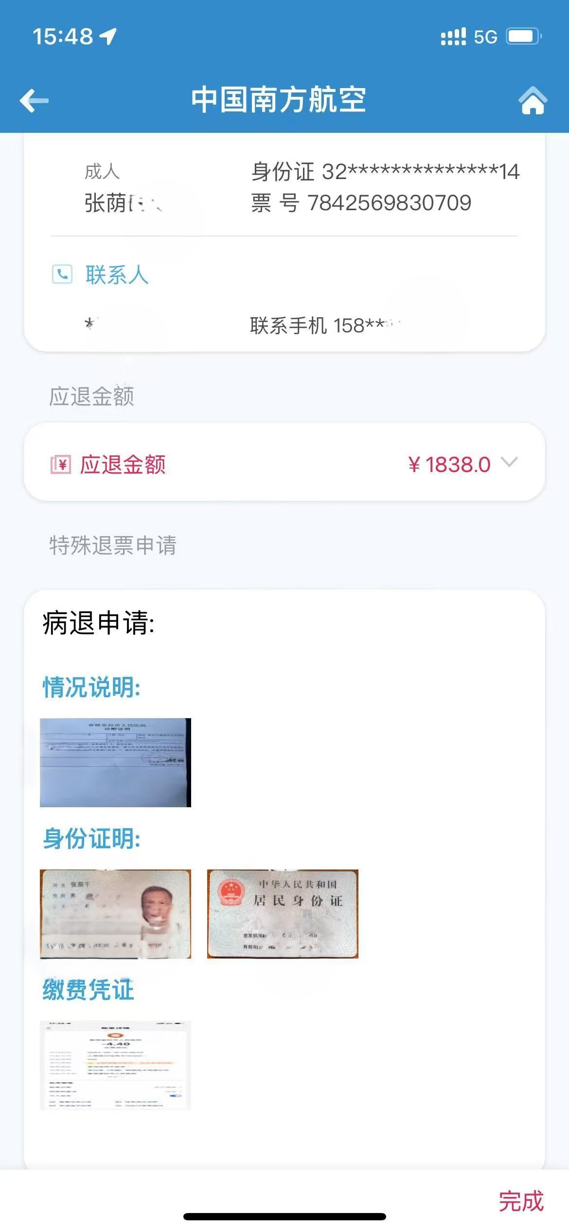“按照公告,我母親作為同行人員完全合乎規(guī)定。不過(guò),南航APP的退票操作界面和這個(gè)規(guī)定要求提交的材料有些不一致?!睆埾壬f(shuō),南航APP上病退申請(qǐng)有3項(xiàng):情況說(shuō)明、身份證明、繳費(fèi)憑證,均只能上傳圖片。“我在情況說(shuō)明欄上傳了醫(yī)院的診斷證明,繳費(fèi)憑證欄上傳了購(gòu)買氧氣罐的訂單截圖?!睆埾壬f(shuō),如果南航APP上注明要上傳醫(yī)療發(fā)票或住院押金證明,他就不會(huì)上傳診斷證明了。