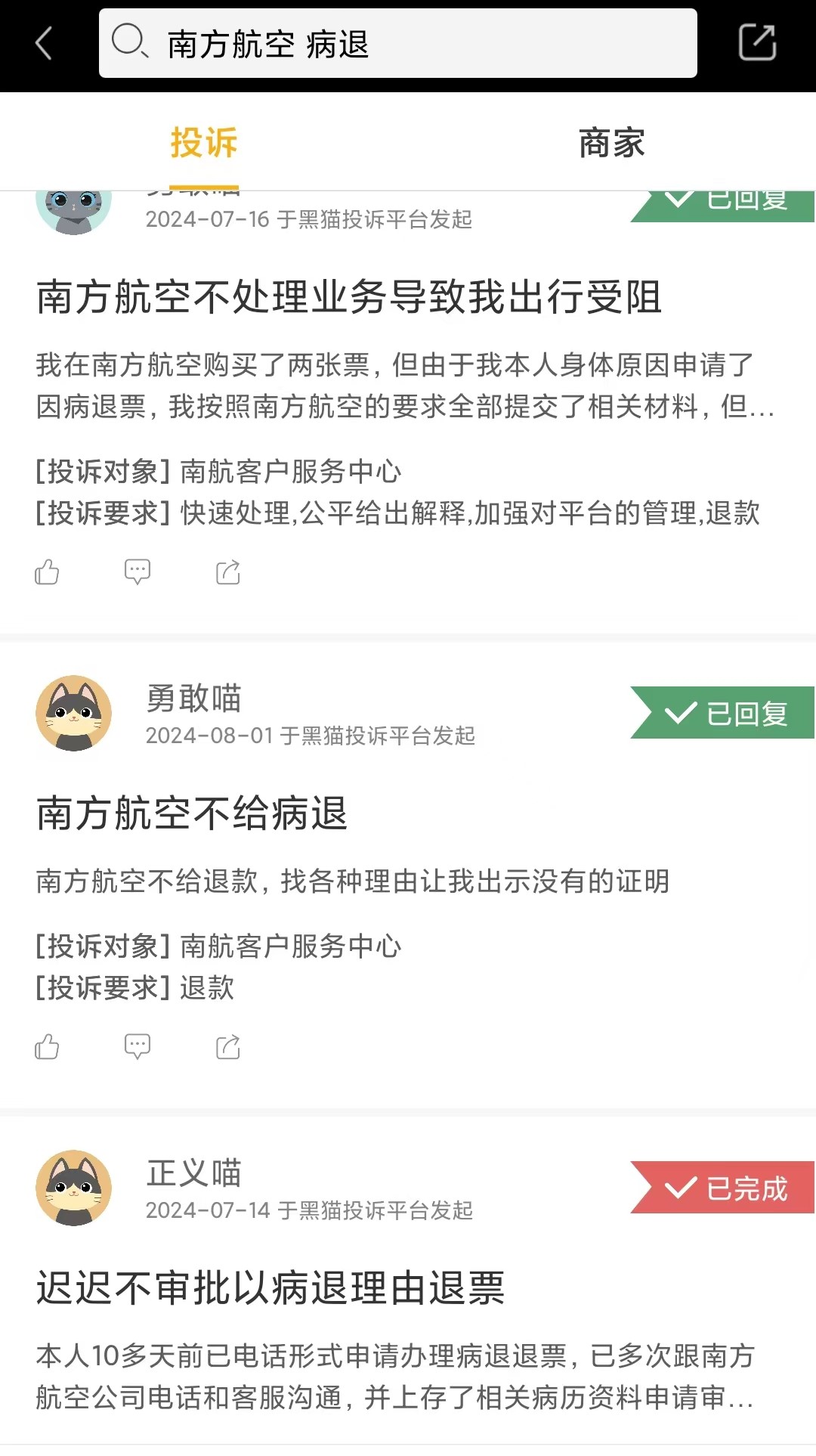 8月26日,記者在黑貓投訴平臺(tái)以“南方航空 病退”為關(guān)鍵詞搜索發(fā)現(xiàn),共有272起相關(guān)投訴,反映的問(wèn)題涉及審核慢、客服人員不專業(yè)、病退申請(qǐng)無(wú)法撤回修改等。