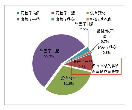 過去一年,國家多個部門發(fā)布了食品行業(yè)的新政策與新法規(guī),對食品工業(yè)行業(yè)嚴加把關,多數市民也認為食品安全狀況得到了改善。55.3%的市民認為食品安全狀況改善了一些,2.5%的市民認為食品安全狀況改善了很多,而在2011年只有35.4%的受訪者認為食品安全狀況在過去一年有所改變,2012年比2011年提升19.9%。