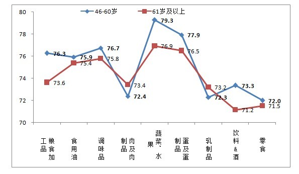 進一步分析46歲以上市民對食品安全現(xiàn)狀擔(dān)憂的食品領(lǐng)域,46-60歲市民對肉及肉制品、乳制品、飲料&酒和零食的安全信心指數(shù)評價較低,直接拉低他們目前對食品安全的放心程度。61歲以上市民目前對九大類食品的安全信心指數(shù)都偏低,除蔬菜水果和蛋及蛋制品外,其它食品的信心指數(shù)都低于65。
